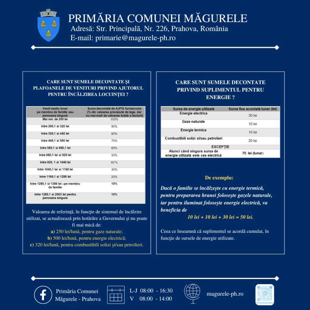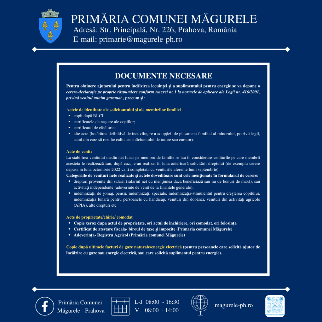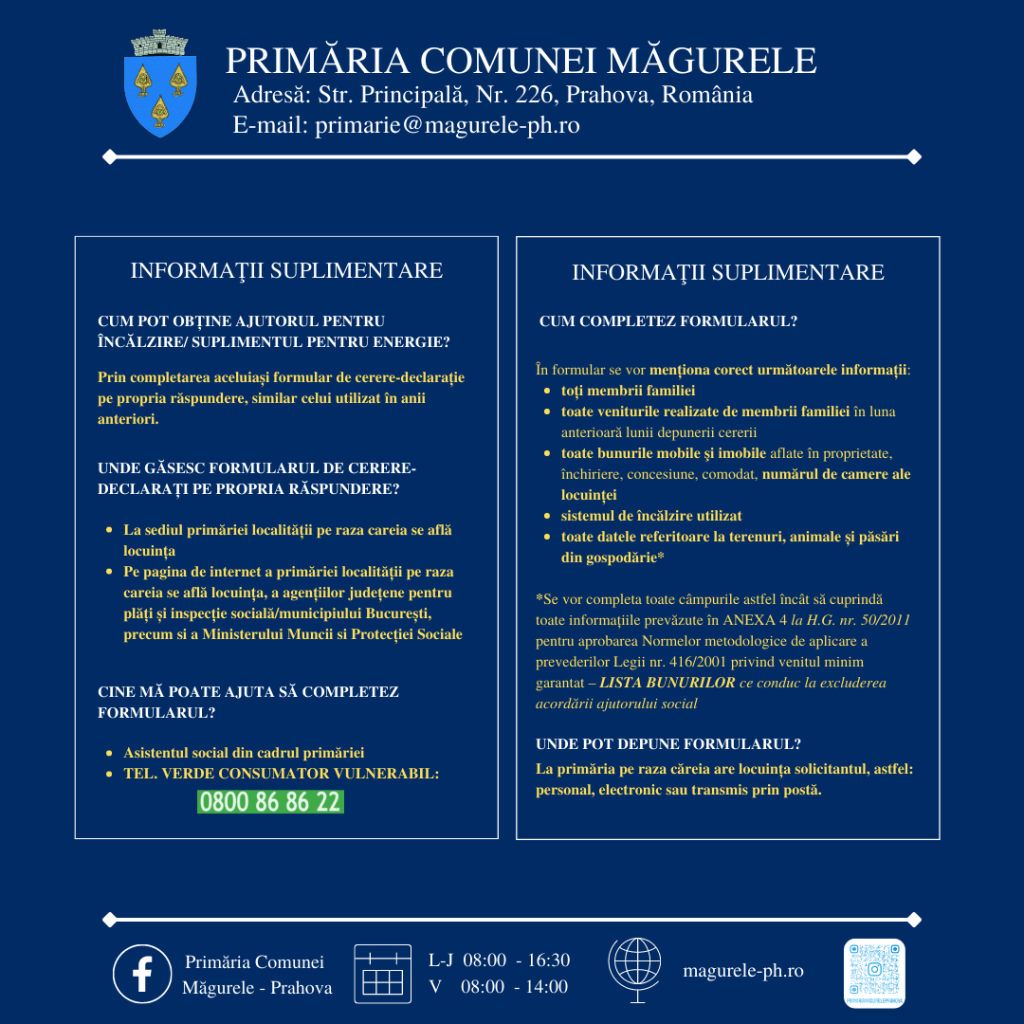 Primăria comunei Măgurele, prin Direcţia de Asistenţă Socială, vă aduce la cunoștință următoarele informaţii referitoare la depunerea dosarelor de acordare a ajutorului pentru încălzirea locuinţei şi a suplimentului pentru energie conform Legii nr.226/2021 privind măsurile de protecţie socială pentru consumatorul vulnerabil de energie.