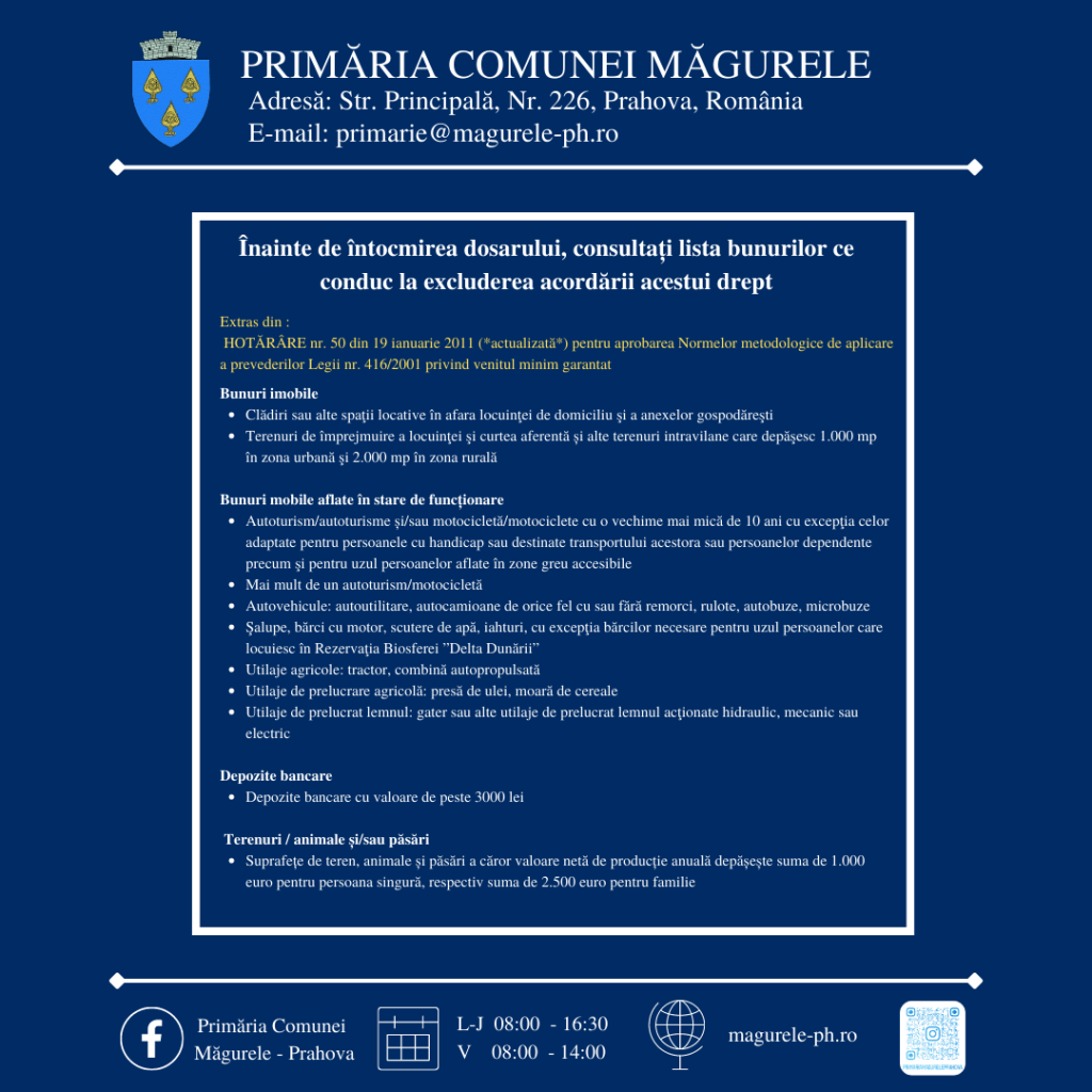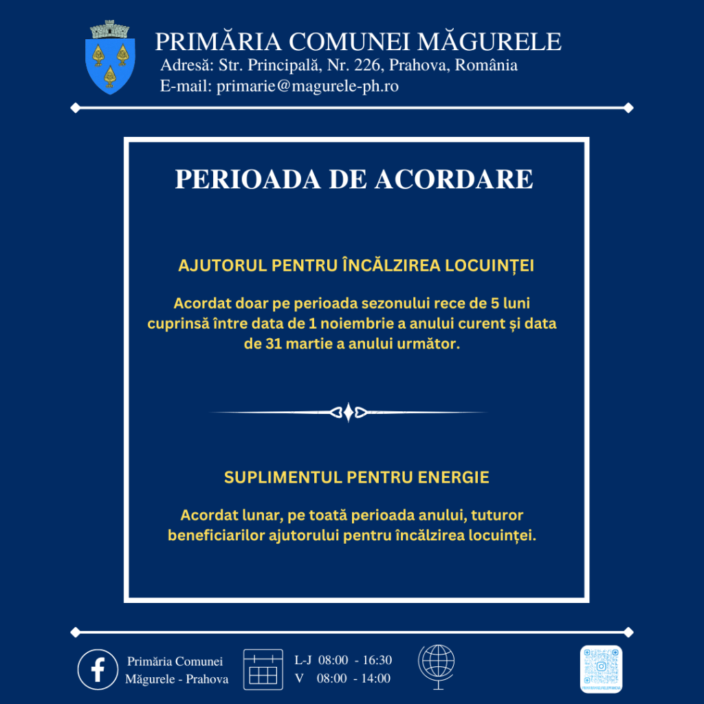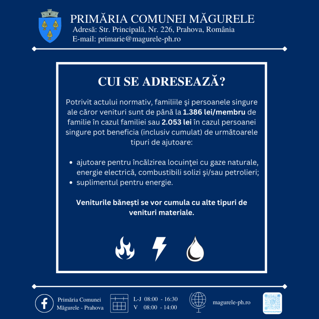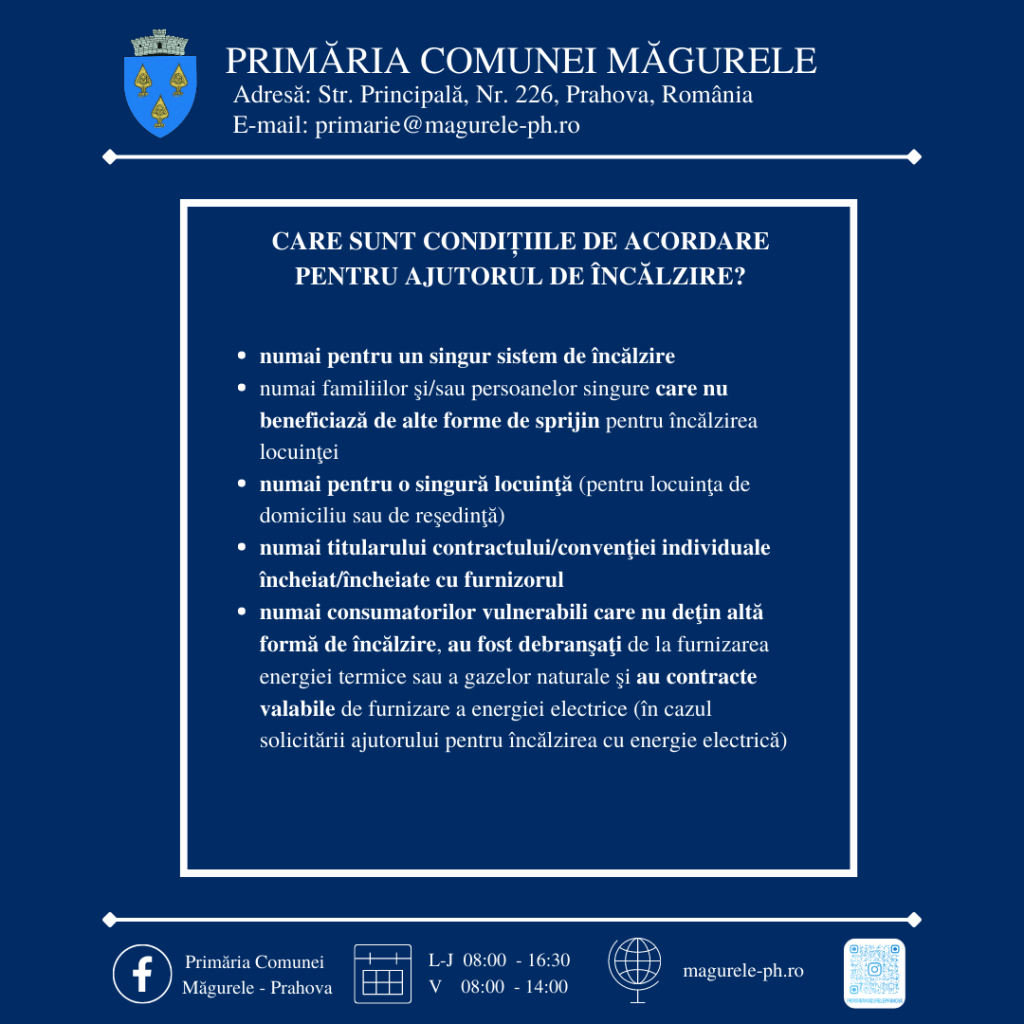 Primăria comunei Măgurele, prin Direcţia de Asistenţă Socială, vă aduce la cunoștință următoarele informaţii referitoare la depunerea dosarelor de acordare a ajutorului pentru încălzirea locuinţei şi a suplimentului pentru energie conform Legii nr.226/2021 privind măsurile de protecţie socială pentru consumatorul vulnerabil de energie.